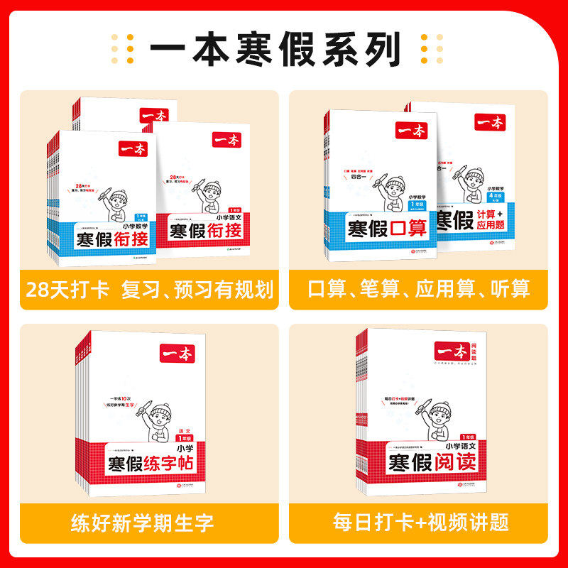 2025版一本小学寒假作业寒假衔接1-6年级,语文口算数学科目,阅读+衔接+口算+练字帖可选,以课程标准为基础,遵循学生认知水平,设计体例、题型及题目难度。本书体现统编教材精神,选文经典,并选取近年真题,有较强的应考价值。