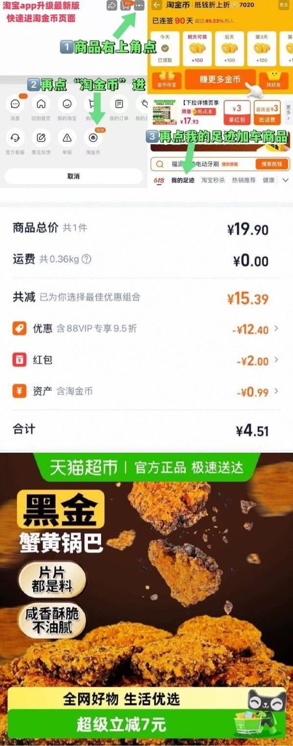 1盼盼蟹黄味锅巴240g💰4.5 88叠金币+2福袋拍才成立 - 商品右上角3个点,选淘金币 再选 我的足迹-找到商品拍下 / AC66/