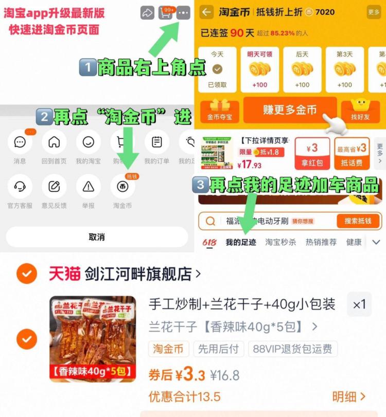 1湖南特产香辣豆干5袋💰3.3 - 商品右上角3个点,选淘金币 再选 我的足迹-找到商品拍下 / AC66/