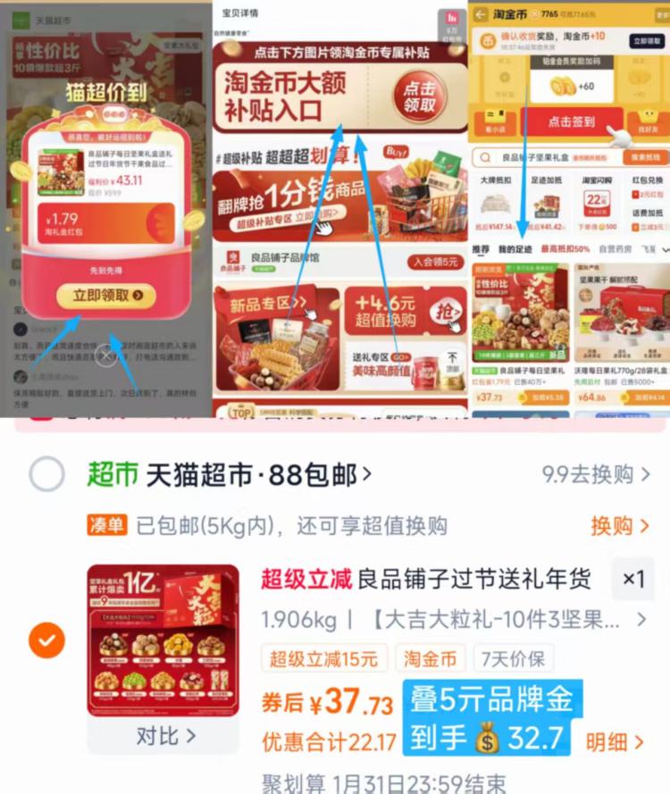 1良品铺子坚果礼盒1.5kg💰32.7 叠礼金+金币+楼上品牌金才成立 - 1.桃寳打开口令,弹礼金领了 2.下滑详情,到淘金币页面拍 若弹限时鸿宝,到手会更低👍 / AC66/