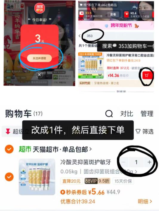 1速度‼5-10💰冷酸灵牙膏7支 - 1、领礼金加入购物车1件 2、下拉详情进zbj领20-3虹包 直bo间找到商品加购物车1件 3、如图右上角叠“淘金币” 我的足迹找到商品加车1件 4、购物车数量修改为1件拍 / AC66/