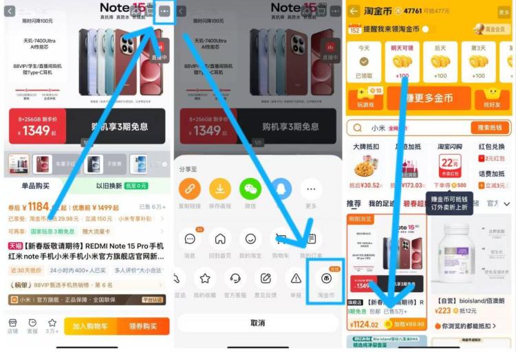 1小米 Note 15 Pro💰1124 - 商品右上角3个点,选淘金币 再选 我的足迹-找到商品拍下 / AC66/