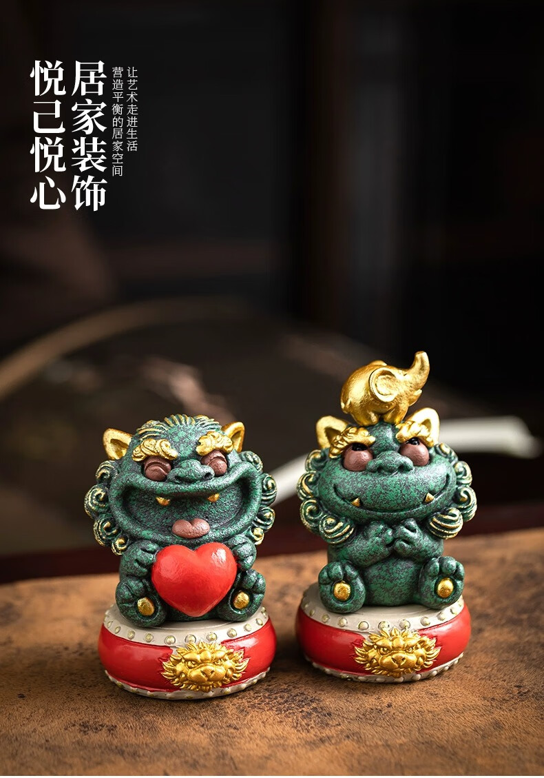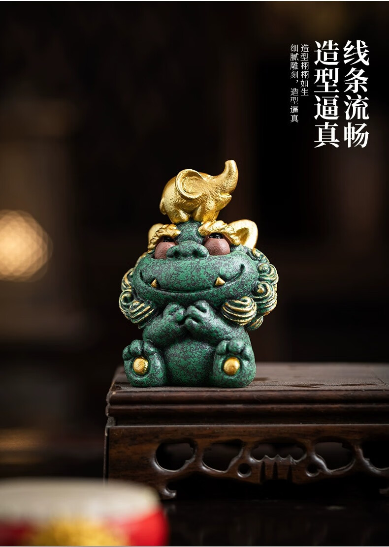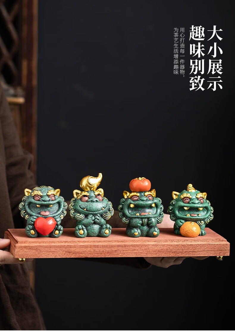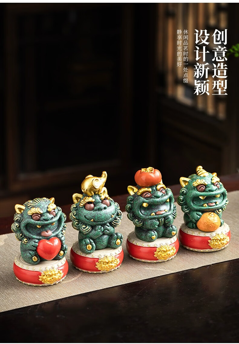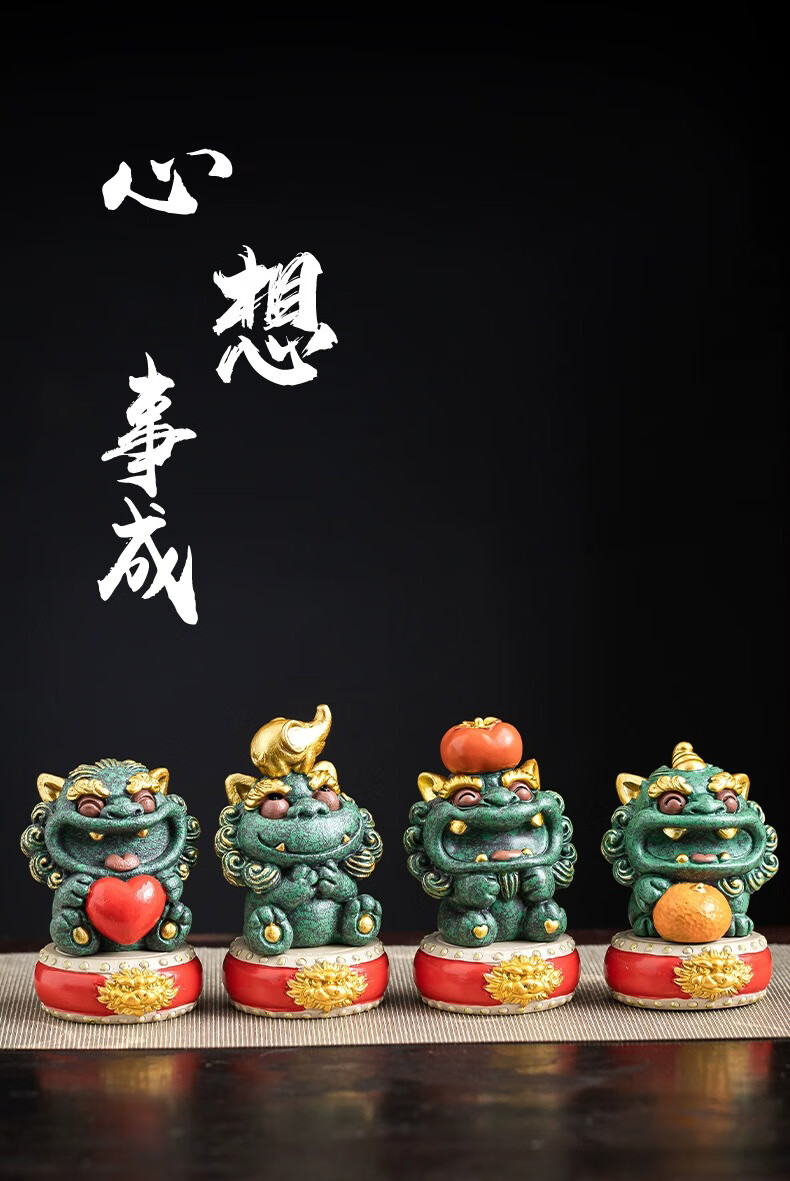 BOSSY故宫风文创招财石狮子心想事成茶宠工艺品桌面摆件公司办公室装饰 心想事成【彩金】+长木底座+礼盒
