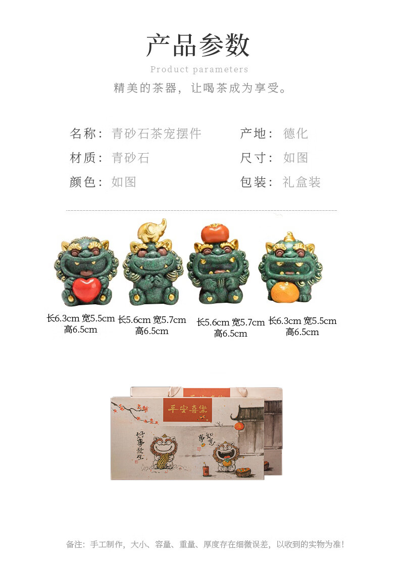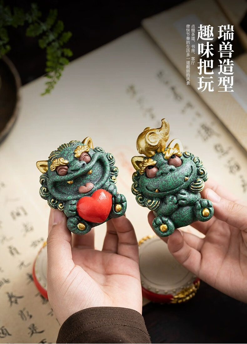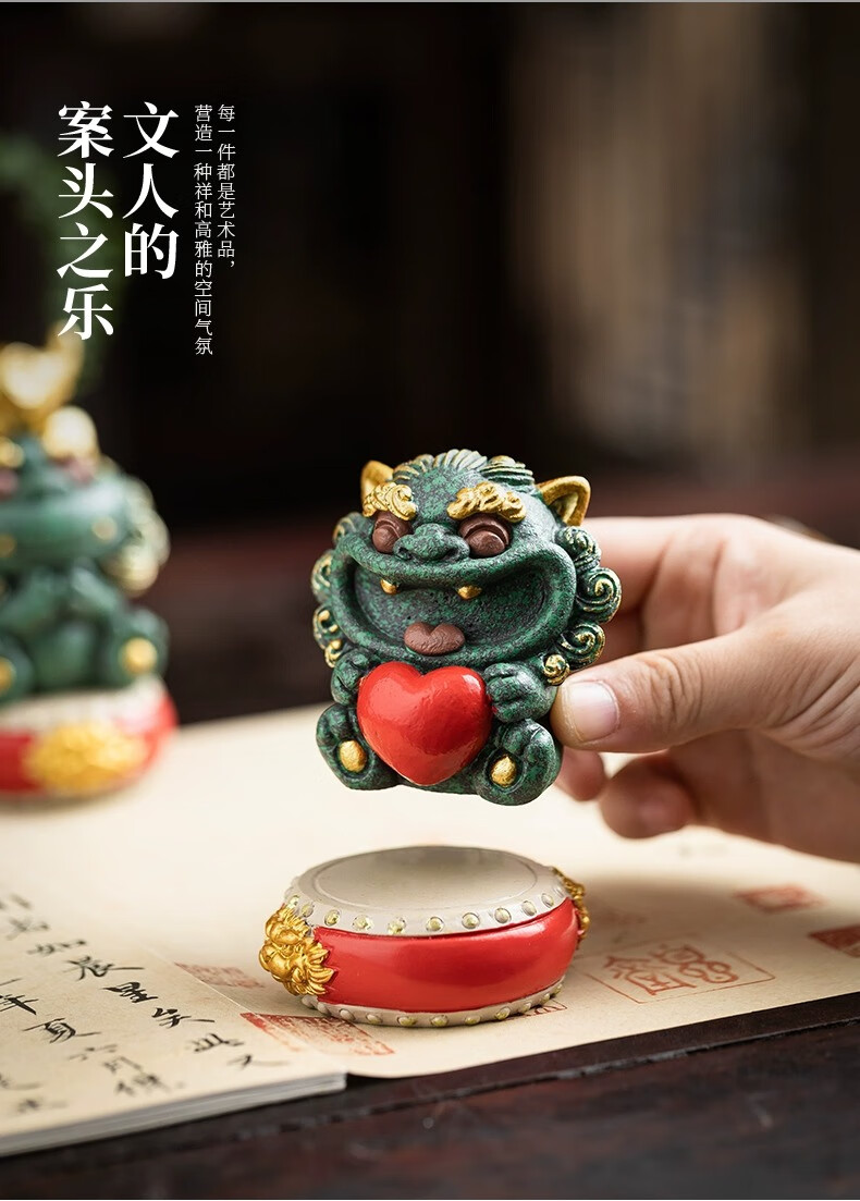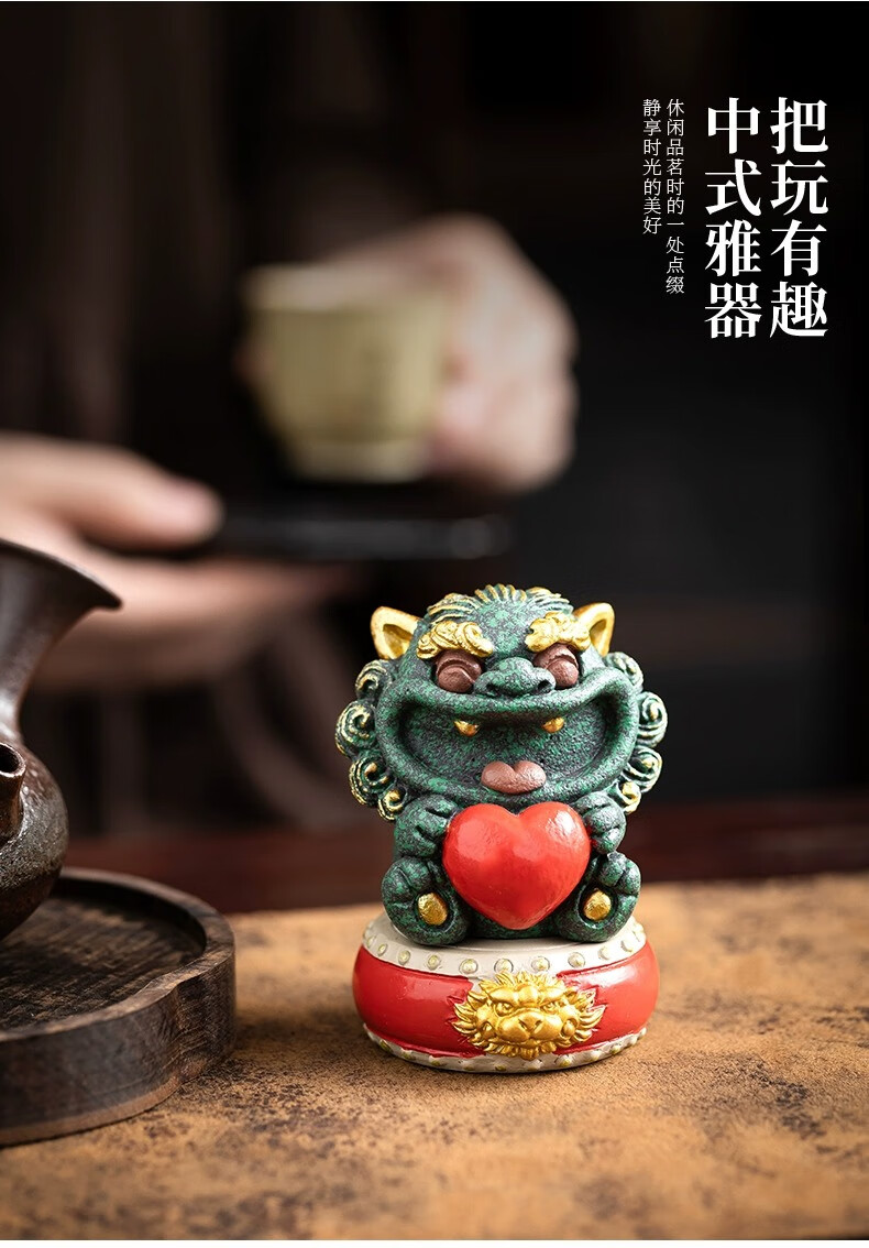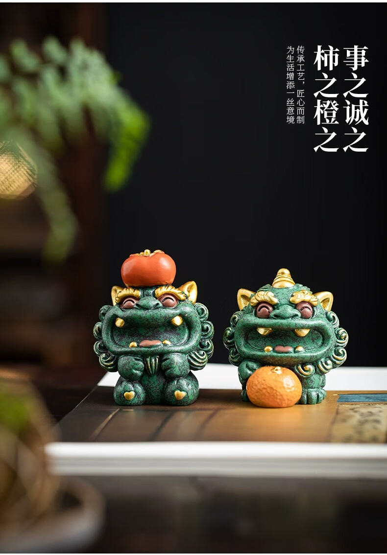 BOSSY故宫风文创招财石狮子心想事成茶宠工艺品桌面摆件公司办公室装饰 心想事成【彩金】+长木底座+礼盒